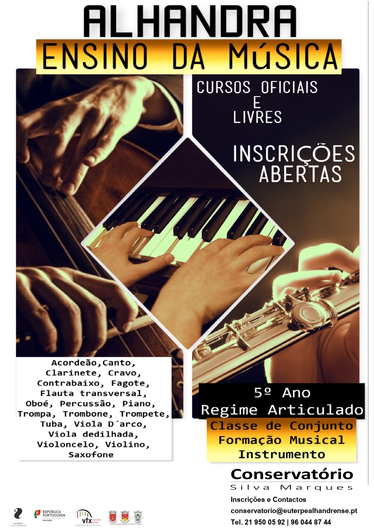 Cursos Oficiais e Livres (a partir dos 6 meses de idade): Música para Bebés | Atelier Música e Movimento | Oficina Musical | Laboratório Musical | Cursos Oficiais -Preparatório (1º CEB), Articulado (2º e 3º CEB) e Supletivo (Secundário) » Formação Musical, Classe Conjunto e Instrumento (Acordeão, Canto, Clarinete, Cravo, Contrabaixo, Fagote, Flauta Transversal, Oboé, Saxofone, Percussão, Piano, Trompa, Trombone, Trompete, Tuba, Viola d’Arco, Viola Dedilhada, Violoncelo e Violino).