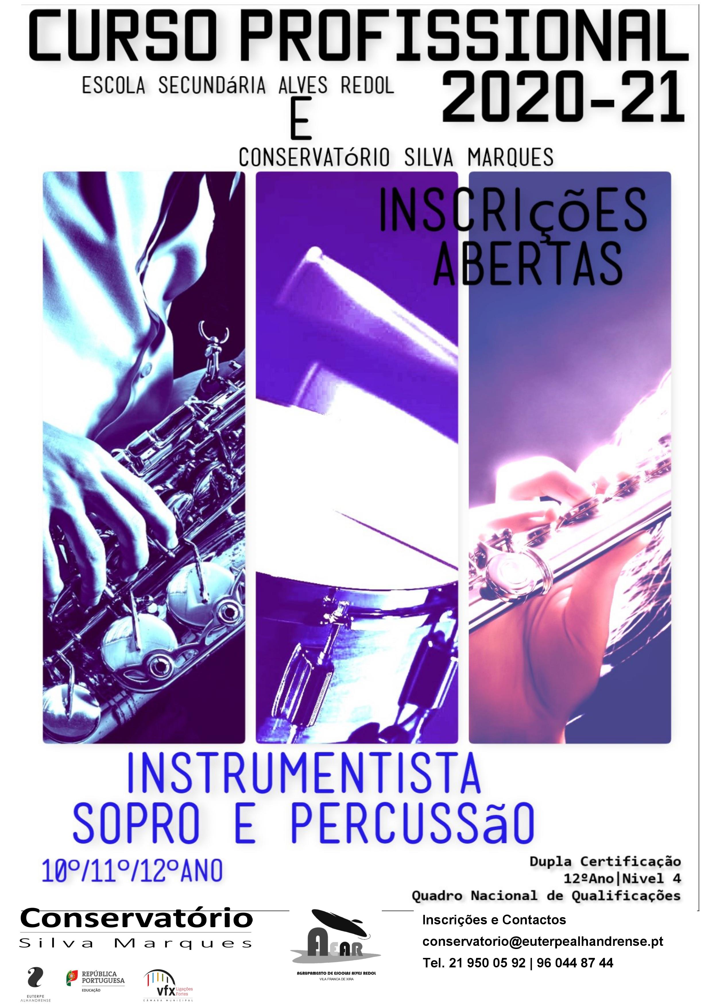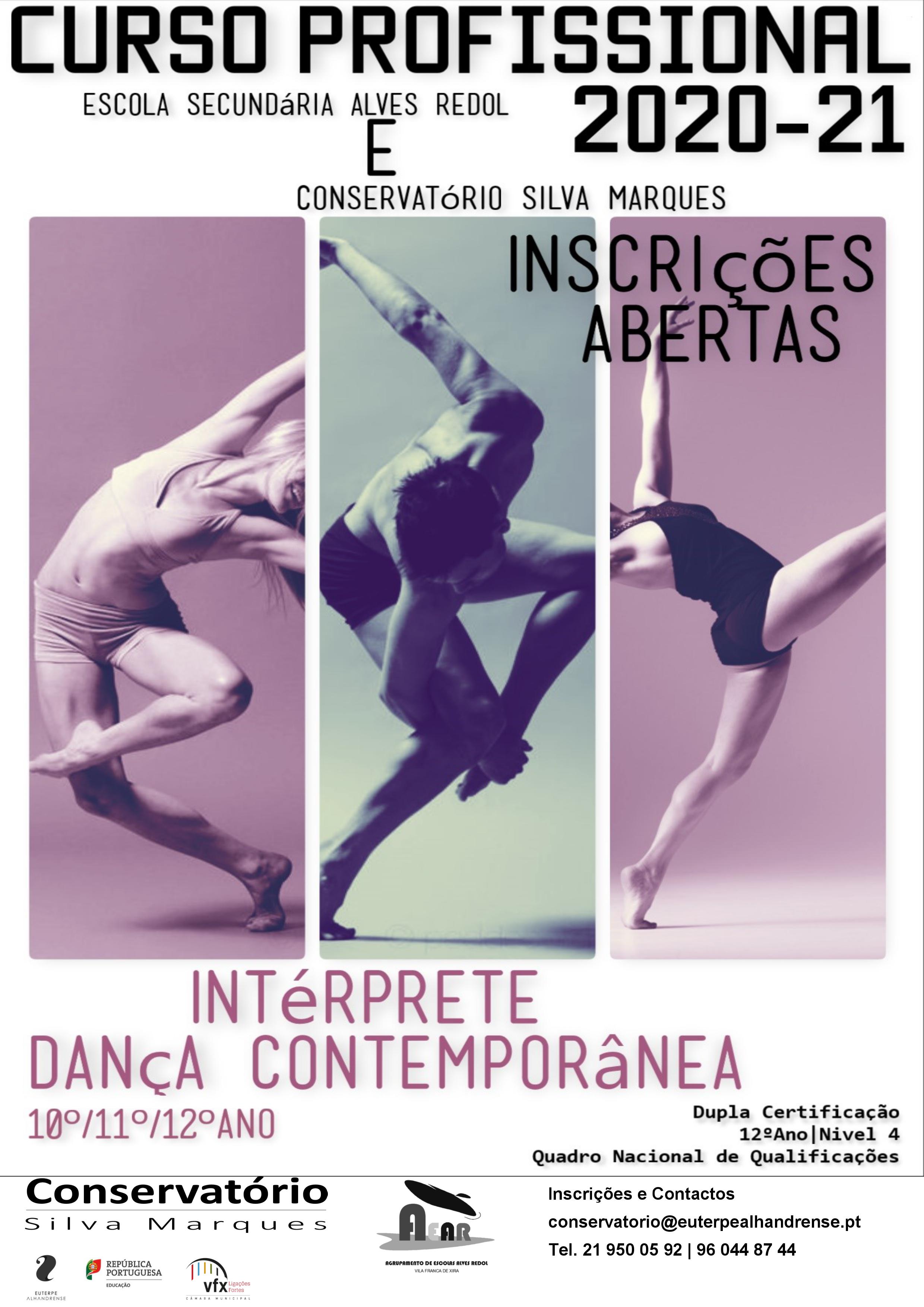 Estão a decorrer Pré-Inscrições para os Cursos Profissionais de Dança e Música (nível 4). Uma parceria do Conservatório Regional Silva Marques com o Agrupamento de Escolas Alves Redol. Download da ficha de Pré-Inscrição aqui https://drive.google.com/file/d/13badJLydRd33WbyTsqMNqufU7HaWLDu6/view?usp=sharing